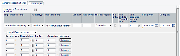 Dieser Parameter zieht nur bei der Kalendertagsmethode und bei Inlandsreisen; damit werden Taggelder nach den definierten X Tagen pro Einzelreisen automatisch steuerbar; Scope ist immer die Einzelreise! - Gültig von - bis