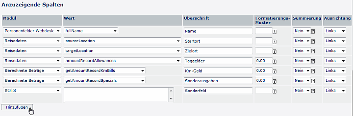 Anzuzeigende Spalten
