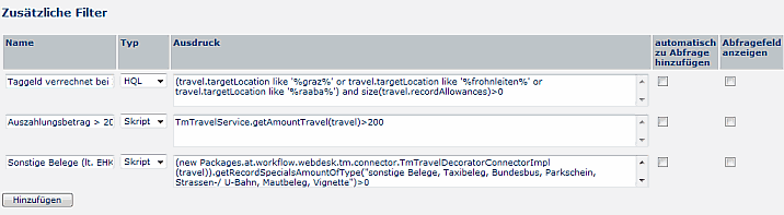 Mit den zusätzlichen Filtern (Typ HQL oder Skript) können weitere Abfragekriterien hinzugefügt werden (wie z.B. Auszahlungsbeträge > 200 Euro, oder wenn sonstige Belege angegeben wurden). Diese zusätzlichen Filter erscheinen dem Benutzer in der Abfragemaske und können nach belieben angehakt werden.
