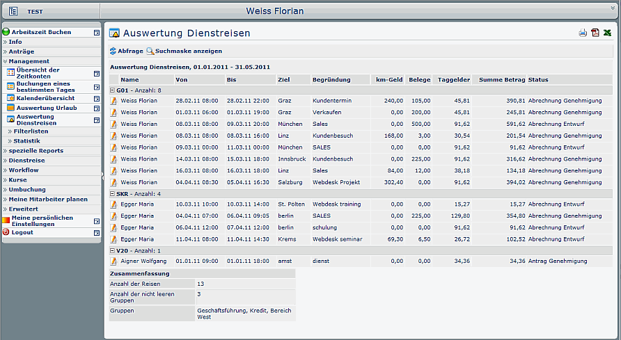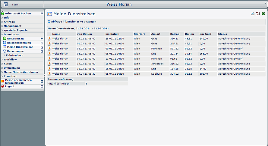Weiters gibt es noch verschiedene Auswertungsansichten für Mitarbeiter, Führungskräfte und die Personalabteilung. Je nach Informationsbedarf können auf Rollen zugeschnittene Auswertungen erstellt werden, welche die Kerndaten der Reise darstellen und direkten Zugriff auf das einzelne Formular ermöglichen.