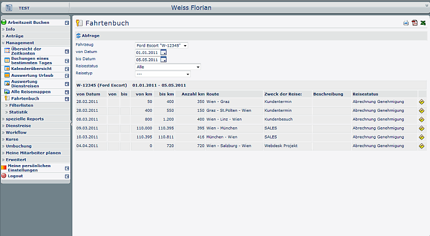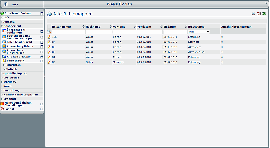 Als Systemadministrator verfügt man über die Möglichkeit, alle Reisen und Fahrtenbücher sowie Reisemappen auswerten zu können.