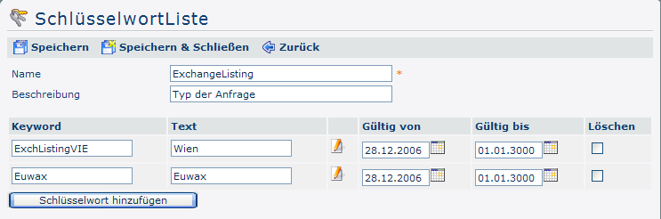 - Löschen - um einen Schlüsselwert zu löschen aktiviert man die Check-Box (durch Anklicken) . Nach Aufruf von Speichern werden die zum löschen markierten Schlüsselworte logisch gelöscht (siehe oben!)