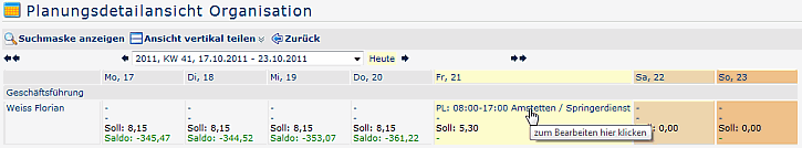 Erstreckt sich die Planungs-Berechtigung nur auf die eigene Person, so kann der Mitarbeiter lediglich sich selbst auswählen und die Planungseinträge lediglich für sich selbst machen.