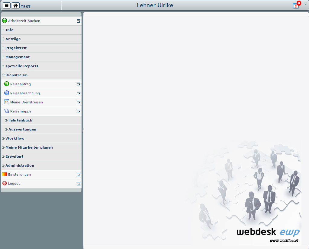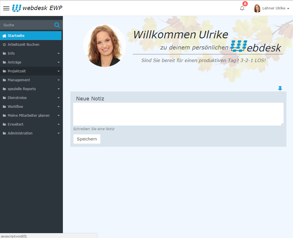 Die Home Page ist die Startseite der Anwendung. Systemmitteilungen werden hier angezeigt (sofern vorhanden). Die Darstellung differiert je nach Einstellung und Version.