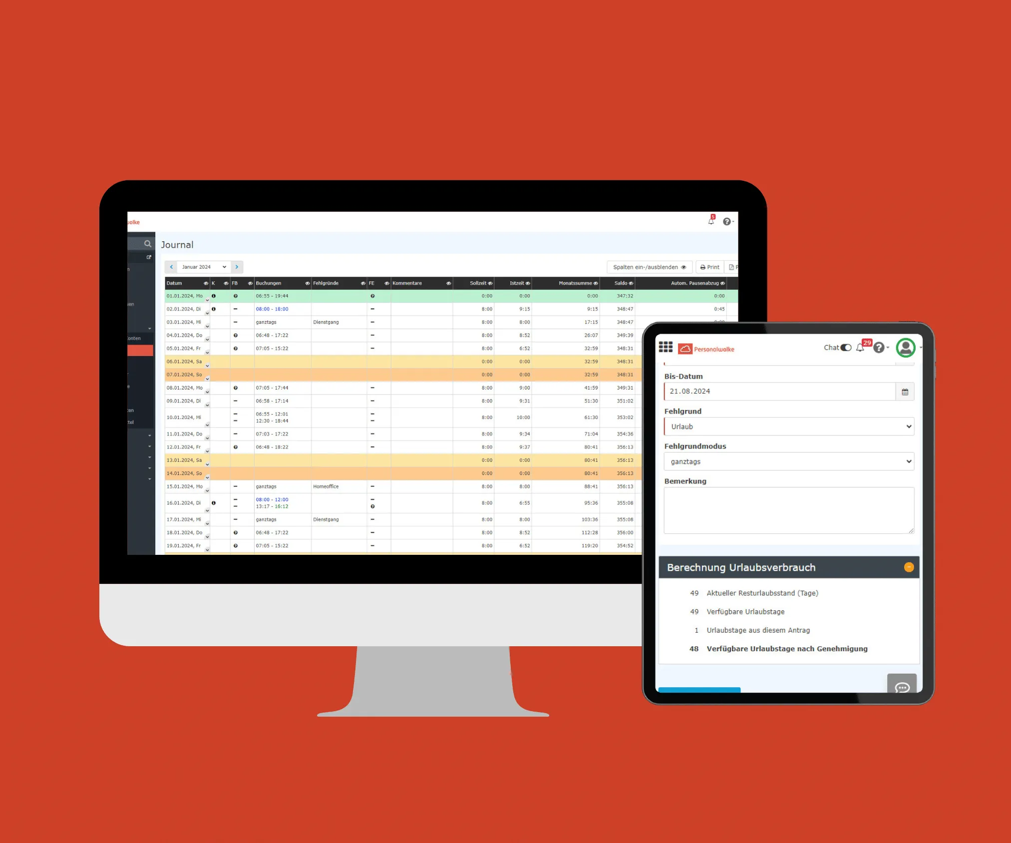 Die Personalwolke bietet für alle Mitarbeitenden ein integriertes Portal. Aktuelle Urlaubsstände, gearbeitete Arbeitszeiten und geplante Abwesenheiten sind ersichtlich.