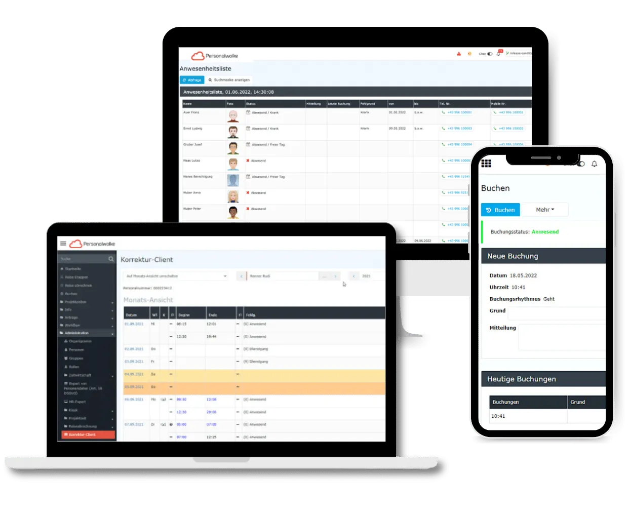Personalwolke bietet Ihnen eine smarte, gesetzeskonforme und mit unzähligen Kollektivverträgen kompatible Zeiterfassung. Wir sind spezialisiert auf österreichischen und internationale Gegebenheiten. Mit hoher Sicherheit, automatisierte Reports, Alerts, Krankmeldung, Self Service, Arbeitszeitmodellen, Jahreskonten und vielen weiteren Features sind wir die führende modulare Lösung.